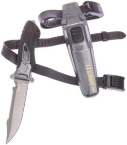 Furthermore, the knife’s blade is sharp and versatile. Made with a partially serrated edge, it allows for efficient cutting of different materials. Whether you’re tackling fishing lines, kelp, or other underwater obstacles, the Tusa FK-940ti X-Pert II will serve you well, enhancing your diving experience.