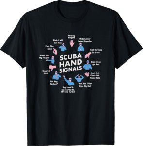 Imagine you’re beneath the surface, exploring a vibrant coral reef, and you spot your dive buddy giving you a thumbs up or a ‘shark’ signal. These scuba diving hand signs are crucial for safety and camaraderie in the water. With this T-shirt, you can wear your enthusiasm for these hand gestures proudly. It’s an excellent conversation starter and a fun addition to any diver’s wardrobe.